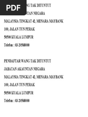 Related : Pendaftar Wang Tak Dituntut Menara Maybank : Jabatan akauntan negara malaysia (janm),bahagian pengurusan wang tak dituntut,tingkat 42, menara maybank 100 jalan tun perak,50050 kuala lumpur..
