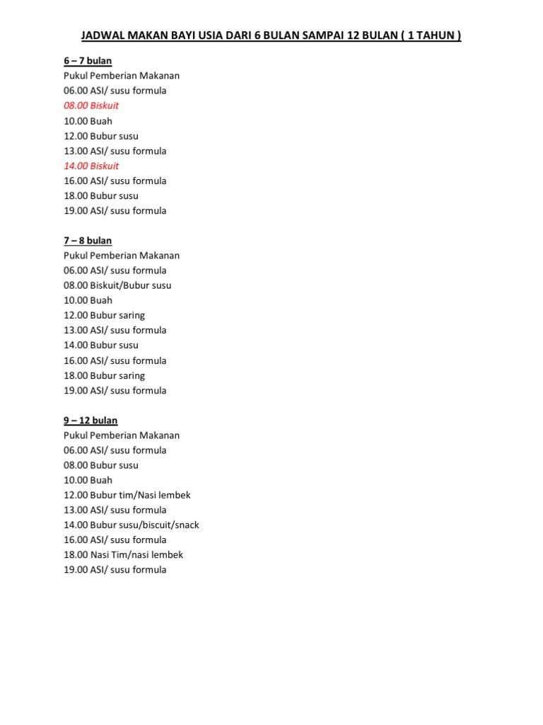 Jadwal Makan Bayi 6 Sampai 12 Bulan : Makanan satu ini bisa kamu berikan pada bayi untuk memperkenalkan rasa gurih.. Bayi anda juga akan memiliki banyak gigi sehingga akan mendorong dia untuk mencoba makan menggunakan. Terapkan aturan makan bayi sejak dini. Mpasi bayi 6 bulan merupakan sebuah keharusan demi kelangsungan hidup serta tumbuh kembang bayi. Oleh karena itu, jadwal makan bayi 6 bulan keatas haruslah menyenangkan. Jadwal makan bayi yang tepat harus anda lakukan secara rutin dan diberikan mulai dari pagi hari si kecil bangun hingga malam hari sebelum tidur.